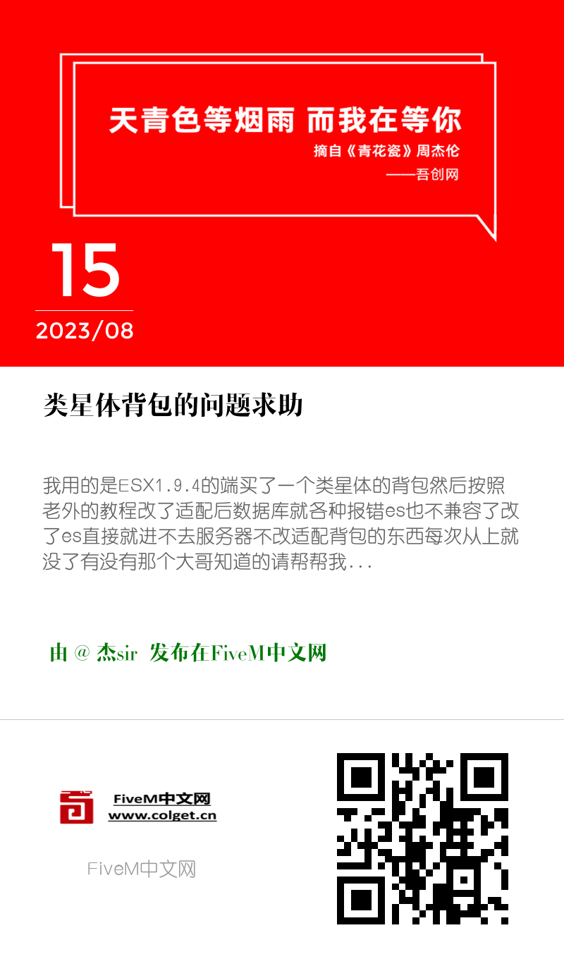 我用的是ESX1.9.4的端 买了一个类星体的背包 然后按照老外的教程改了适配后数据库就各种报错 es也不兼容了改了es直接就进不去服务器 不改适配背包的东西每次从上就没了有没有那个大哥知道的请帮帮我...