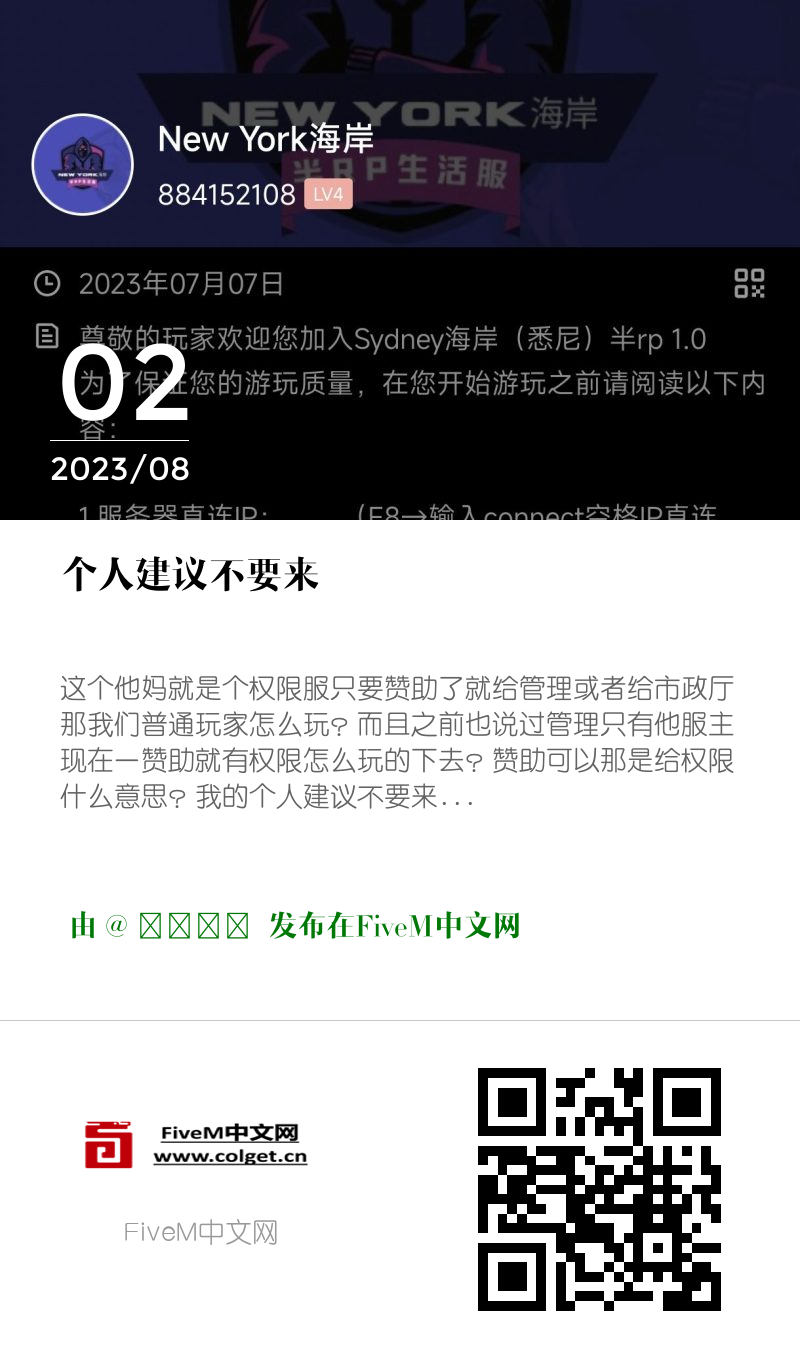 我是一个刚接触fivem不久的新玩家,玩了许多个服务器但是都玩不久就退了。接触这么多下来我觉得东京梦华这个服真心不错,里面的每一位玩家人都很好也很热情!服主也很好不会权限玩家,有问...