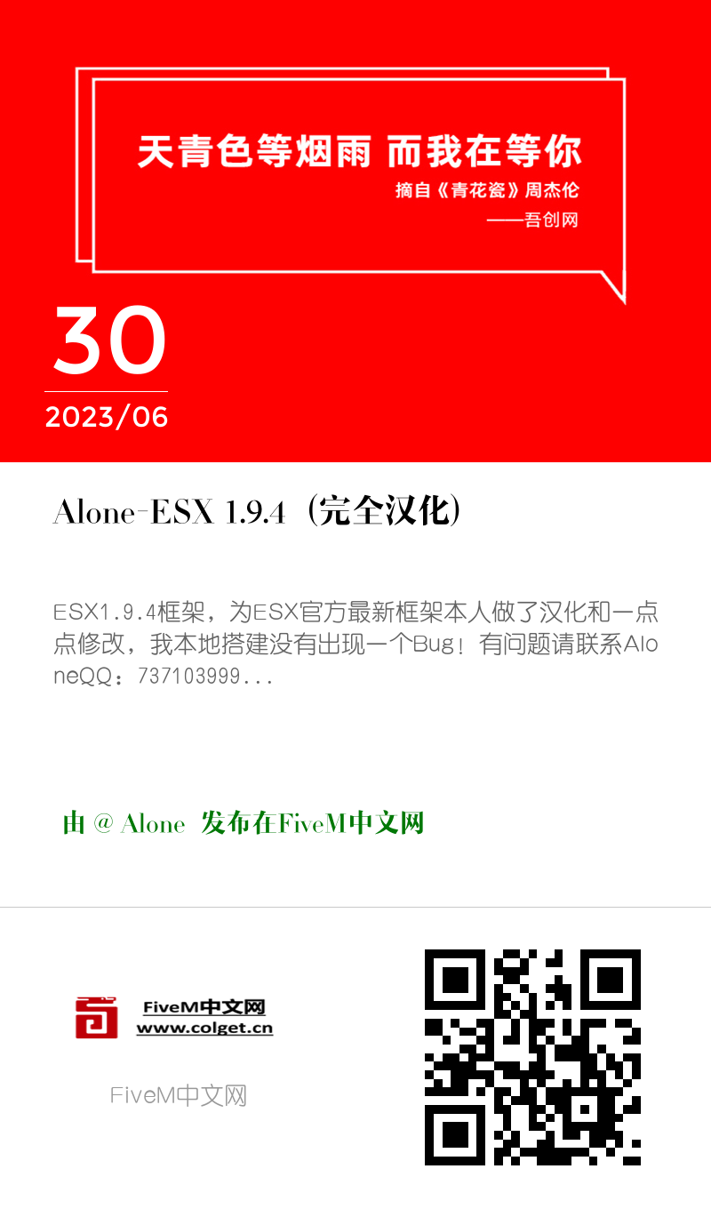 ESX1.9.4框架,为ESX官方最新框架本人做了汉化和一点点修改,我本地搭建没有出现一个Bug!有问题请联系Alone QQ:737103999...